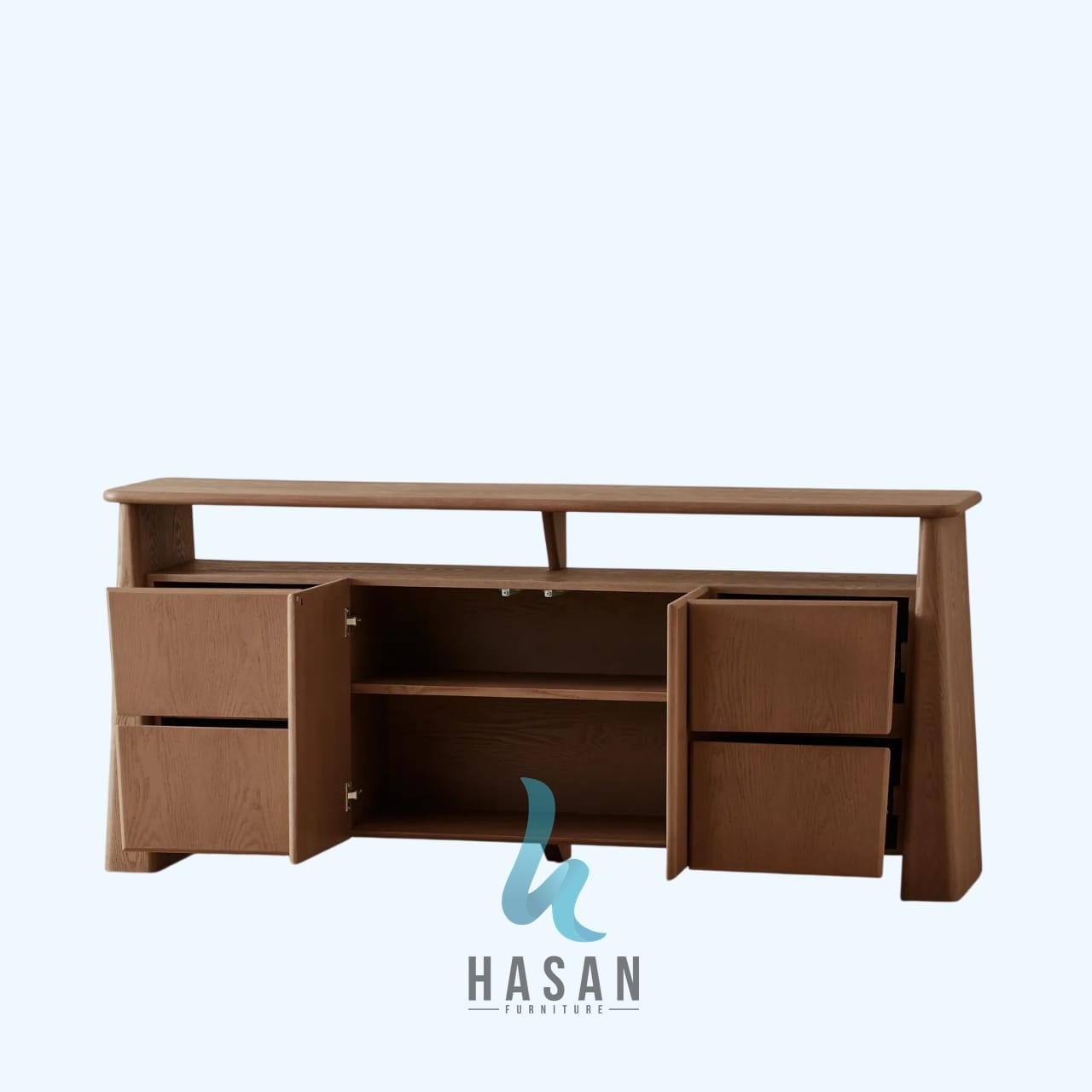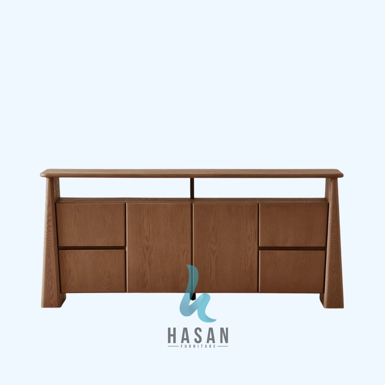 Sideboard ini mengusung garis desain yang bersih dan minimalis khas gaya Nordik, namun tetap mempertahankan kekuatan material kayu jati solid khas Hasan Furniture. Penggunaan kaki meruncing (tapered legs) memberikan struktur yang kokoh sekaligus memudahkan Anda dalam membersihkan area lantai di bawah furniture.