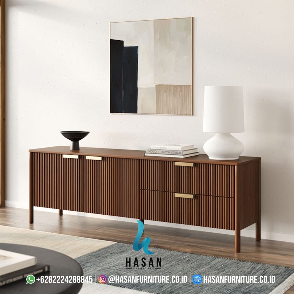 Sideboard Walnut Fluted Minimalis adalah solusi penyimpanan yang memadukan estetika mid-century modern dengan kebutuhan ruang masa kini. Perpaduan tekstur kayu walnut yang hangat dengan detail vertikal (fluted) memberikan sentuhan artistik yang membuat ruangan tampak lebih berkelas, baik di ruang tamu, ruang makan, maupun sebagai meja TV.